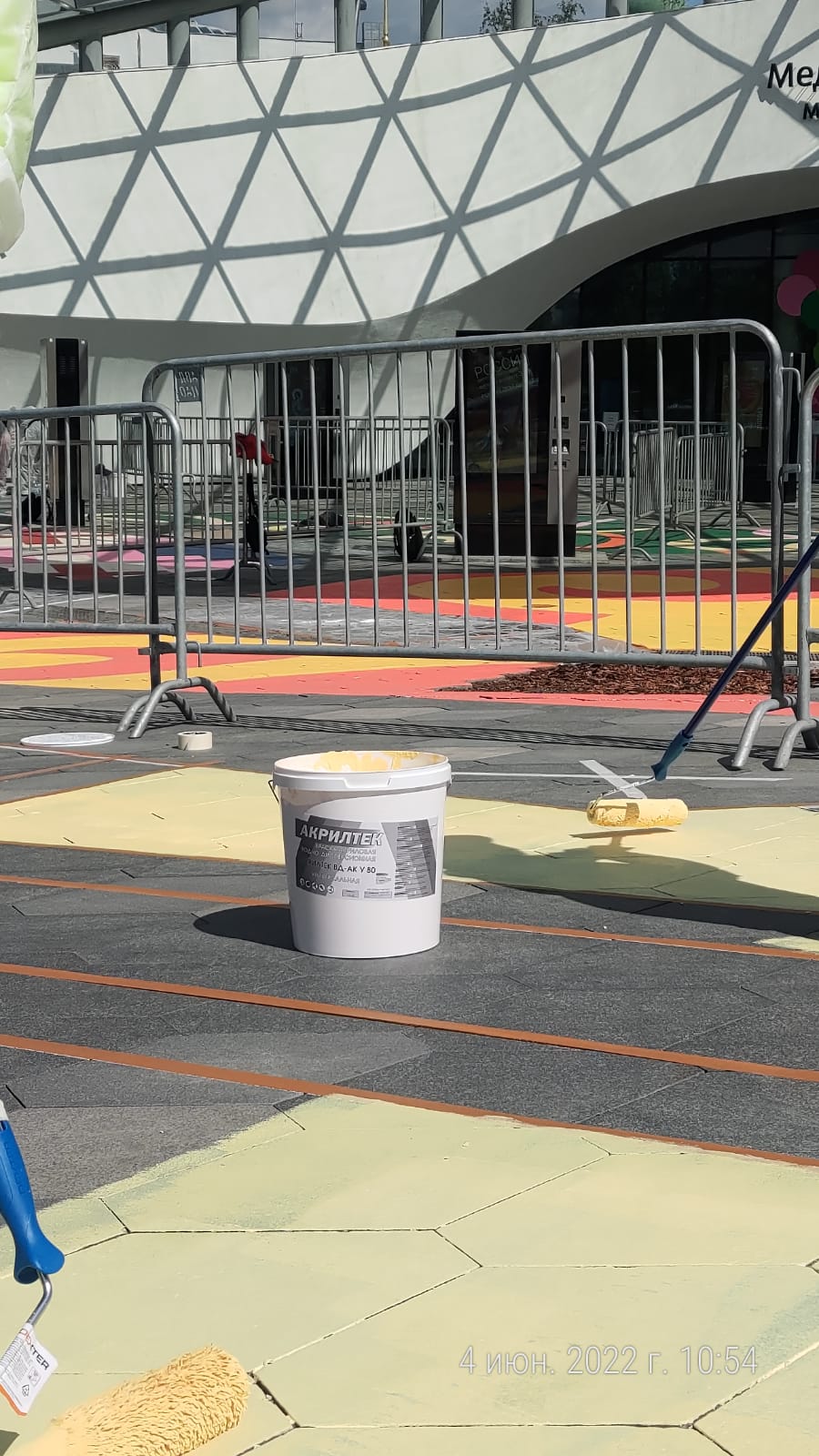 Основные моменты которые озвучил заказчик : краска должна быть без запаха, пожаробезопасна, яркие и насыщенные цвета , не смываться дождем и выдерживать постоянную интенсивную нагрузку т.к. в летний период количество туристов значительно возрастает и самый главный момент, мы должны через 3 месяца убрать ее механически без следов.